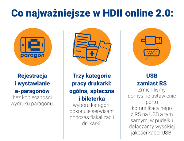 Drukarka fiskalna HD 2 Online po rehomologacji to pierwsze urządzenie należące do rodziny ONLINE 2.0. Dzięki nowemu oprogramowaniu, drukarka została wyposażona w szereg innowacyjnych funkcji. Najważniejsza to możliwość rezygnacji z papierowego wydruku i pełna obsługa e-paragonu, a dzięki temu niższe koszty użytkowania urządzenia. Dodatkowo drukarka może pracować w trzech trybach, jako urządzenie ogólnego zastosowania, wersja apteczna lub bileterka – wybór wersji dokonywany jest jednorazowo przez serwisanta podczas fiskalizacji drukarki. Zmieniliśmy także domyślne ustawienie portu komunikacyjnego z RS na USB, a w pudełku znajdziesz wysokiej klasy kabel USB. W/w funkcje dostępne wraz z nową homologacją ZPT 3/2022 z dnia 22 lipca 2022.